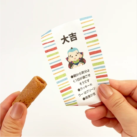 ロールフォーチュンクッキーも、おみくじ入りのお菓子として、その楽しさを大切にしています。