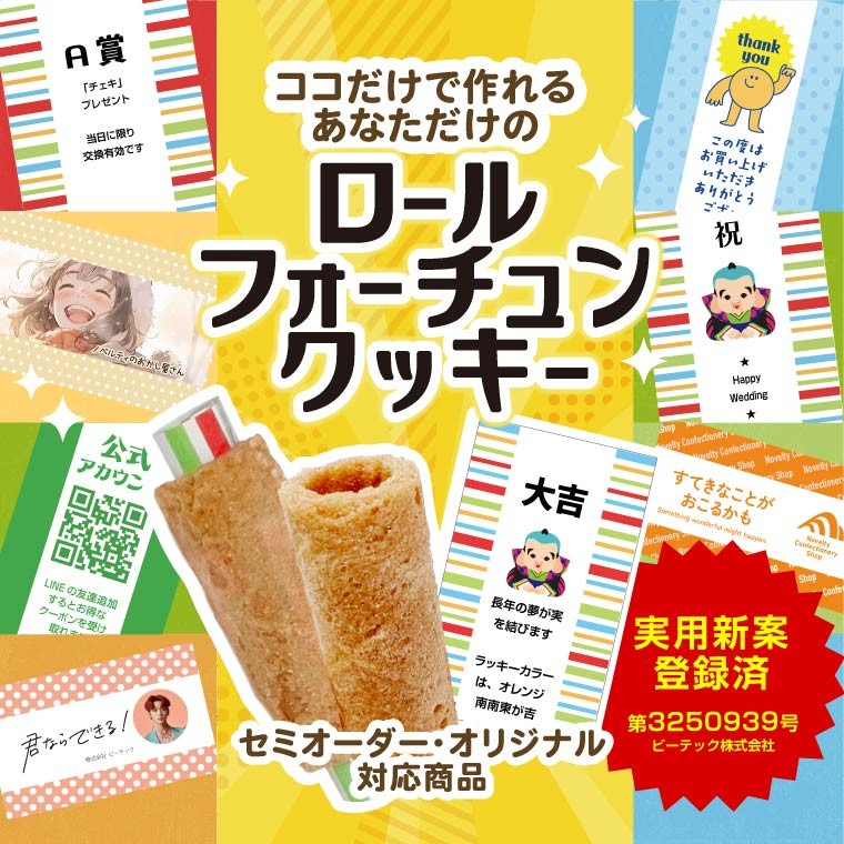 ノベルティ菓子専門ECサイト「ノベルティのお菓子屋さん」(運営:ビーテック株式会社)は、ロール型の新しいフォーチュンクッキー『ロールフォーチュンクッキー』を発売いたしました。