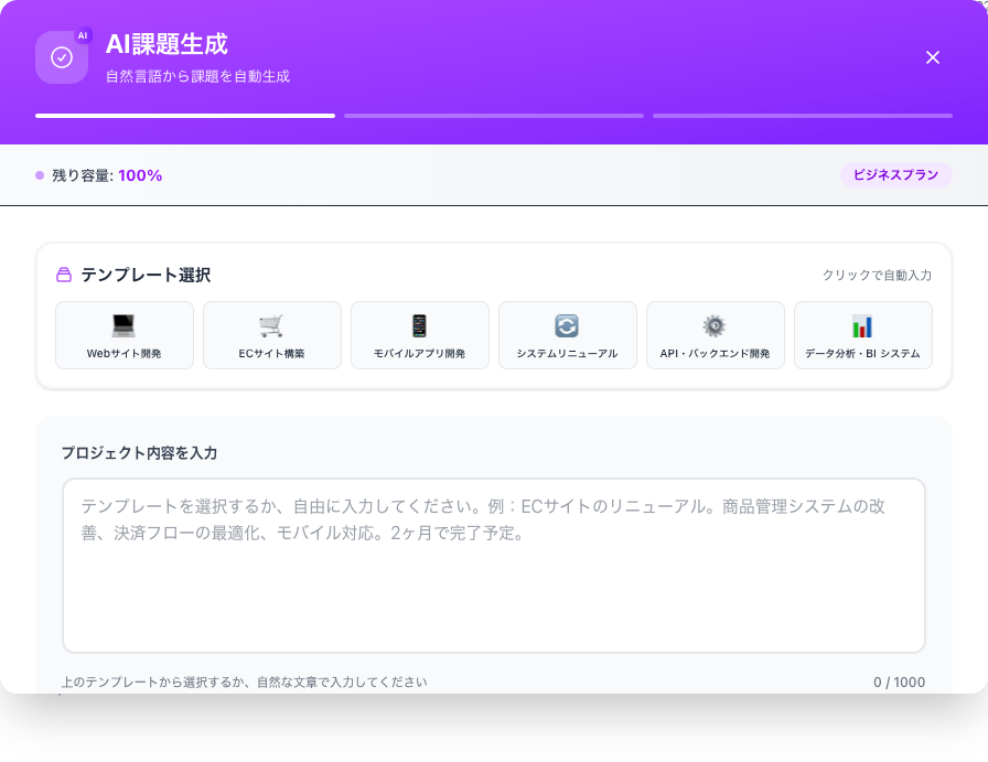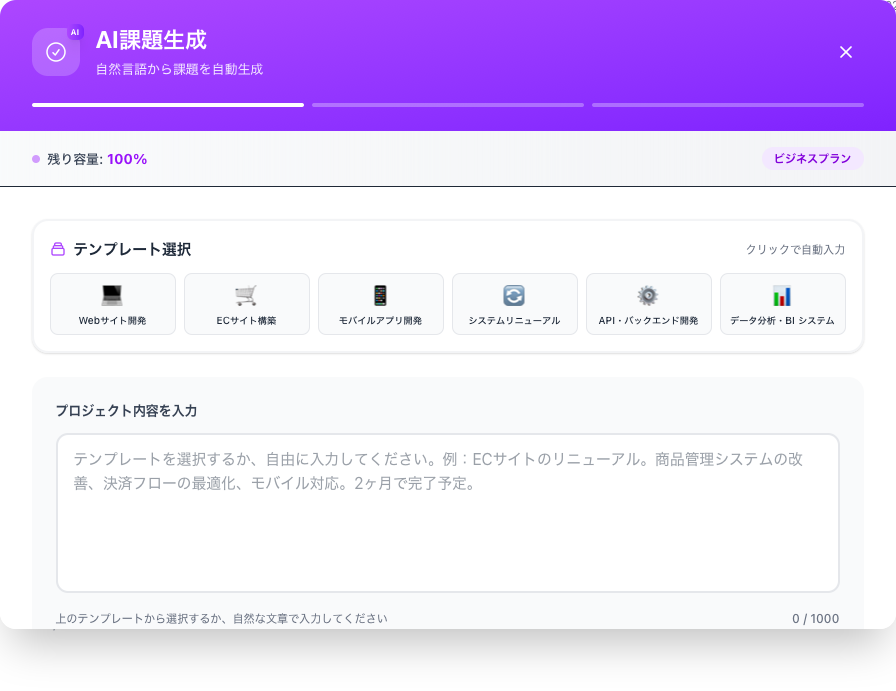 「ECサイト構築、決済機能、会員機能」と自然言語で入力するだけで、AIがタスクを自動生成します。