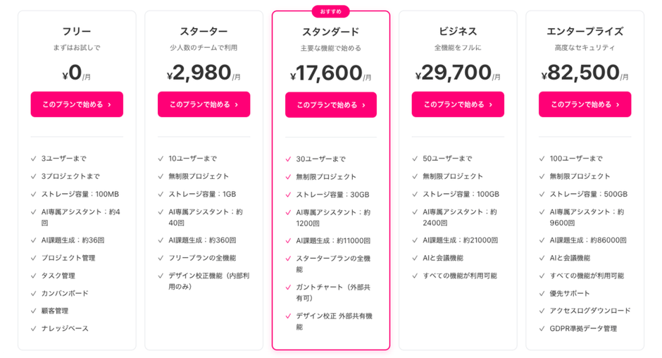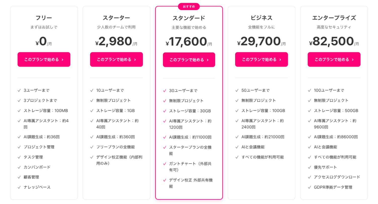 | スタンダード | ¥17,600 | 30名 | 30GB | ガントチャート外部共有、デザイン校正外部共有、スタータープランの全機能 |