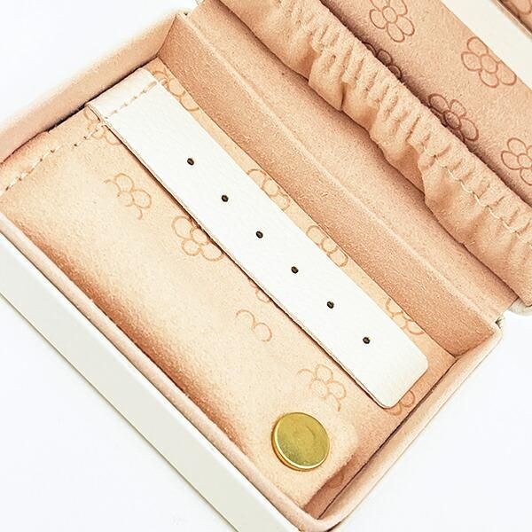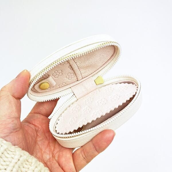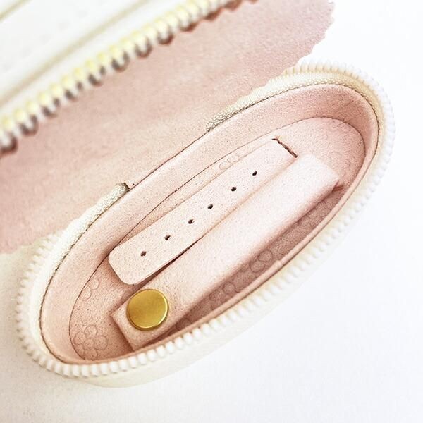 底面にはピアスやリングを固定できるホルダーとベルト、フタ部分にはネックレスやブレスレットを収納できるポケットがあります。大事なアクセサリーを分けて収納できる機能もデザインも優れたケースですよ。