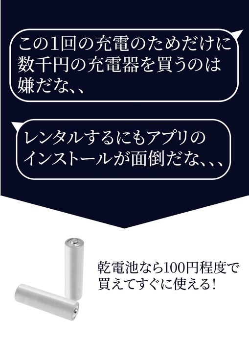 乾電池式なのは、調達のしやすさとモバイルバッテリーの充電を忘れていたら使えなくなるからです。