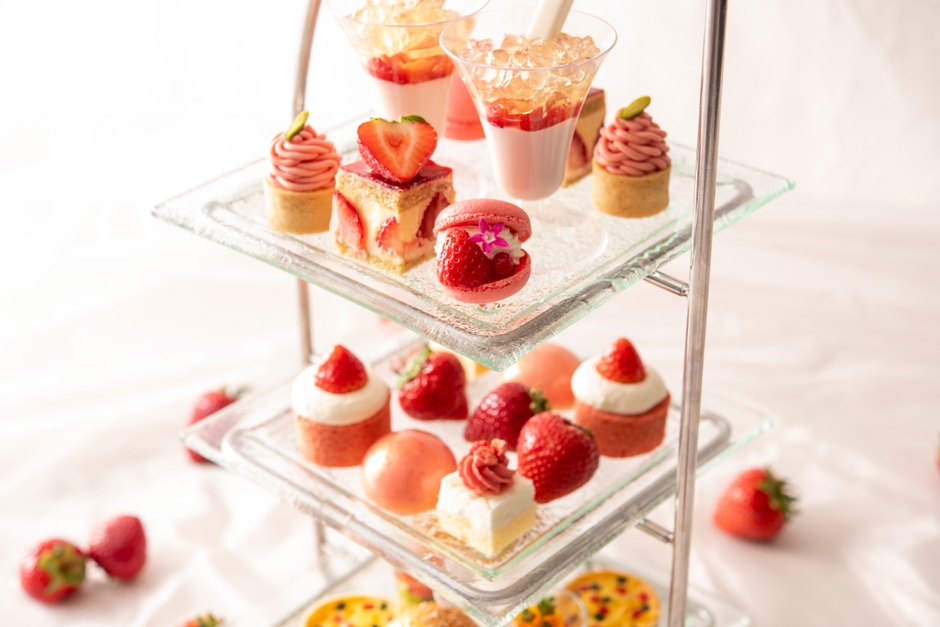 「とちおとめ」や「あまおう」など選りすぐりのフレッシュいちごを贅沢に使用し、パティシエが一つひとつ作り上げる8種のスイーツをはじめ、いちごの魅力が味わえる多彩なアイテムが、ホテルの外観を模した3段のティースタンドに並びます。いちごのフレジェやマカロンなどの人気アイテムに加え、スポイトで練乳をかけながら味の変化を楽しむいちごのパンナコッタや、甘味と酸味のバランスが良い「あまおう」を使用した口どけ滑らかないちごのムース、フレッシュいちごを丸ごと1粒あしらったロールケーキなどの新作もラインナップ。