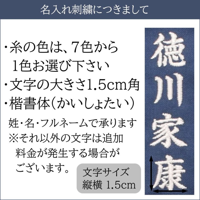 刺繍糸の色は、白、灰、黒、赤、青、黄、緑の7色からお選びいただけます。刺繍内容は、フォント『手書き風筆記体』で『イニシャルのみ』承ります。他の書体やフルネーム、記号などのご希望はできかねます。
