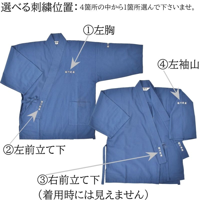 刺繍の位置は左胸・左前立て下・右前立て下・左袖山の4か所