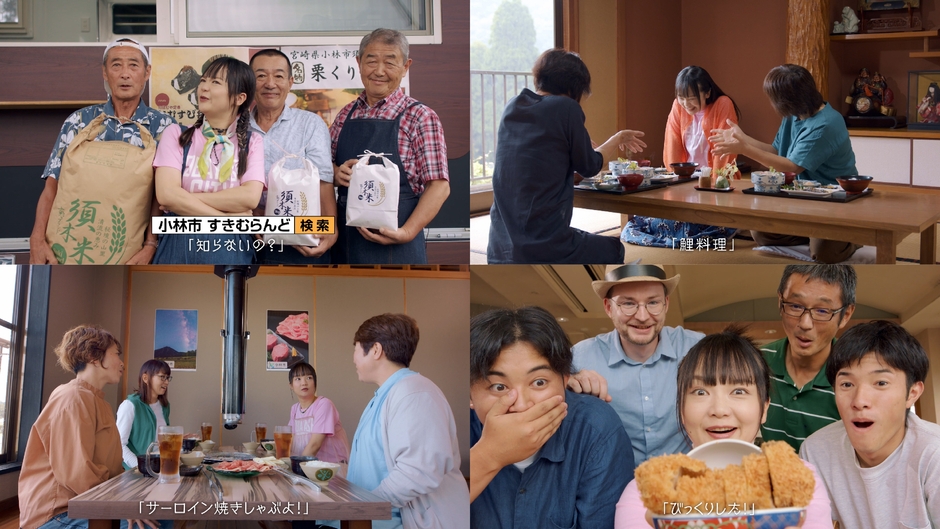 小林市の食の魅力をPRするCMシリーズで、小林市出身の蛙亭・イワクラさん(吉本興業所属)が主演を務め、脇を固めるのは老若男女の市民キャスト。方言で会話を繰り広げながら、郷土料理や新名物料理に舌鼓を打つシーンを描きました。