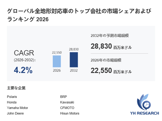 YHResearch調査チームの最新レポート「グローバル全地形対応車のトップ会社の市場シェアおよびランキング 2026」によると、世界の全地形対応車市場は2025年に21690百万米ドル規模に達すると予測され、2026年には22550百万米ドルに拡大する見込みです。2032年までに28830百万ドルに達すると予測されており、2026年から2032年までの期間における年平均成長率(CAGR)は4.2%と予想されています。