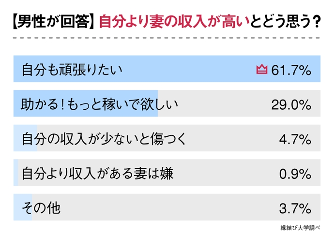 調査では、「稼ぐことはいいが自分も頑張りたい」と考える男性が61.7%であることが分かりました。「自分の収入が少ないと傷つく」という人は少数ですが、手放しに「助かる!もっと稼いで欲しい」と思う人は、29%にとどまっています。