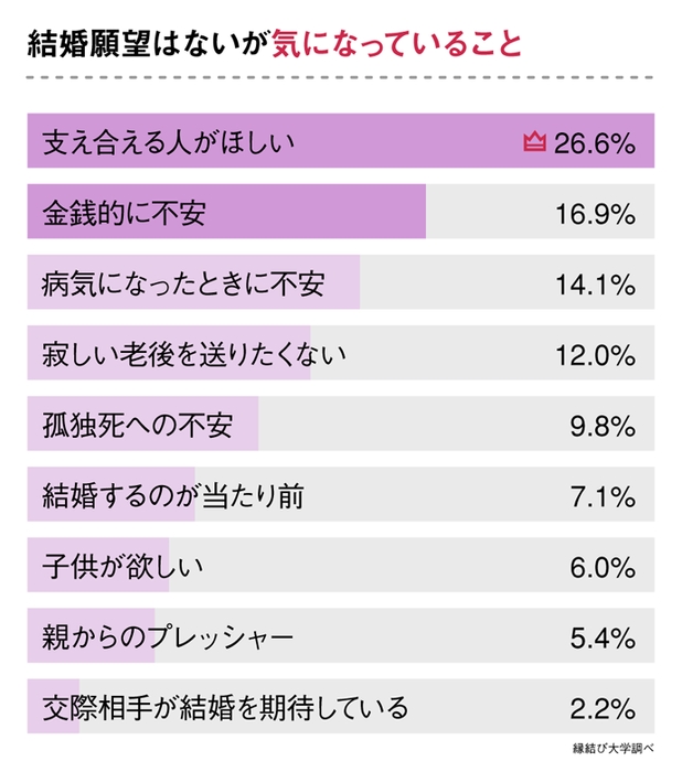 すると、26.6%の人が結婚願望がある人と同じように「支え合う人が欲しい」と感じていることが分かりました。また、「金銭的」「病気」「老後」について不安があると答えた人もいました。