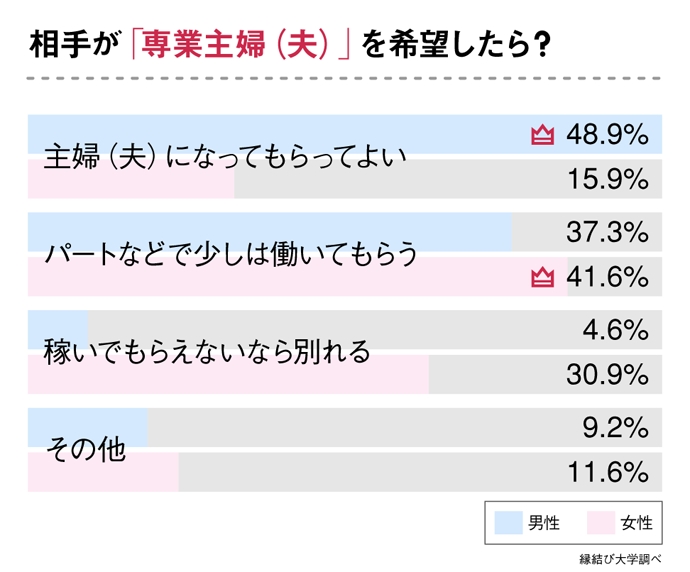 男女別でみていくと、「専業主夫になるなら別れる」という男性は12.2%にとどまり、「専業主婦になるなら別れる」という女性も10.6%いました。