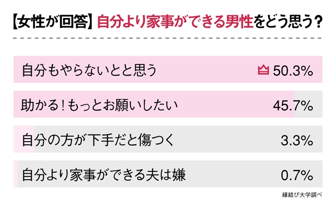 夫のほうが家事が上手いと「自分ももっとやらなきゃ」と思う女性が50%
