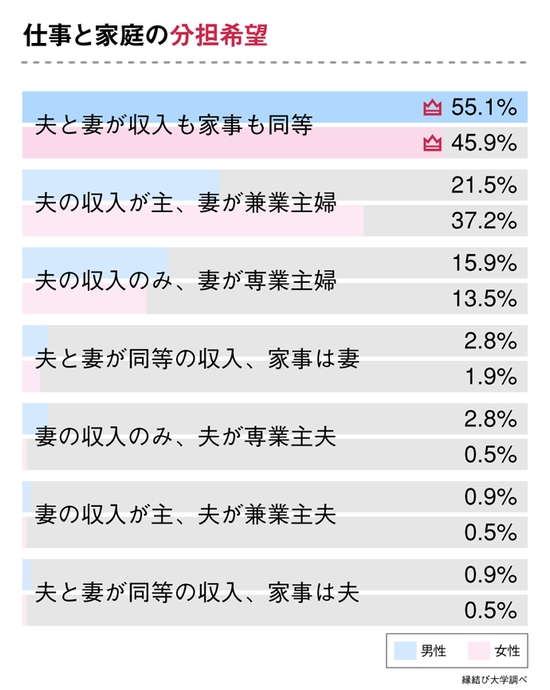 最も多かったのは、男女とも「夫と妻が収入も家事も同等」という回答でした。ただし、男性は55.1%だったのに対し、女性は45.9%にとどまっています。“結婚生活において男女平等”を希望するのは、女性よりも男性の方が多いことが分かりました。