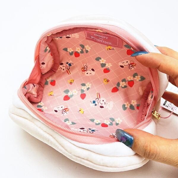 クリームサンド違いのデザインもございます。こちらは クリームサンドポーチ ストロベリーのデザインです。ほんのり焼き色も付けられていて、ついつい食べたくなってしまうかわいさです。ポーチの中のデザインはストロベリー味ということでいちごとスヌーピーのデザインがなんともラブリーです。