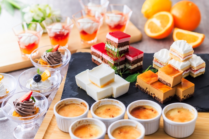 ダイニングでのお料理は、地元の新鮮な海山の幸を取り入れたブッフェスタイルで、四季の恵みをお楽しみいただけます。メインディッシュは料理人が目の前で仕上げるライブキッチンで出来立ての料理をコース料理の一品のように盛り付けご提供いたします。ディナータイムは18:00~23:00(ラストオーダー21:00)とゆとりのある時間と、座席数も十分にご用意しておりますので、ゆっくりとお食事やご歓談をお楽しみいただくことができます。
