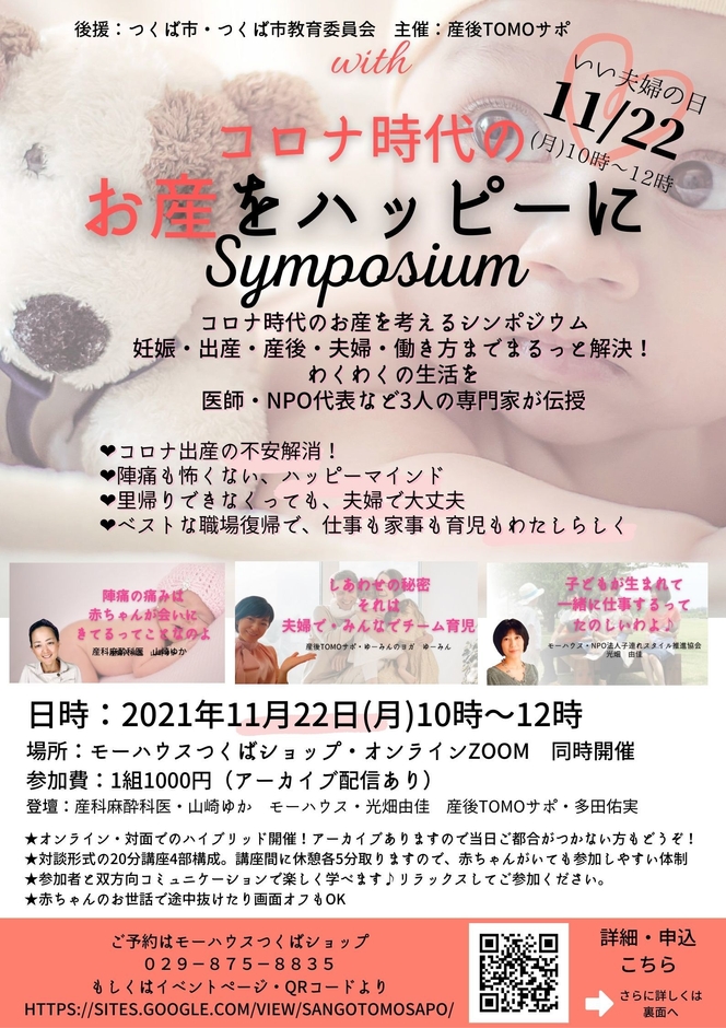 産前産後のママ・パパと赤ちゃんをサポートとする産後TOMOサポ・ゆーみんのヨガ(所在地:茨城県つくば市)は、「Withコロナ時代のお産を考えるシンポジウム」を、11月22日(月)“いい夫婦の日”にモーハウス つくばショップとオンラインにて開催いたします。