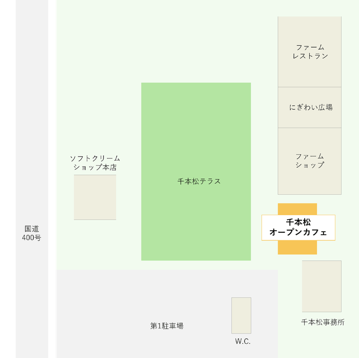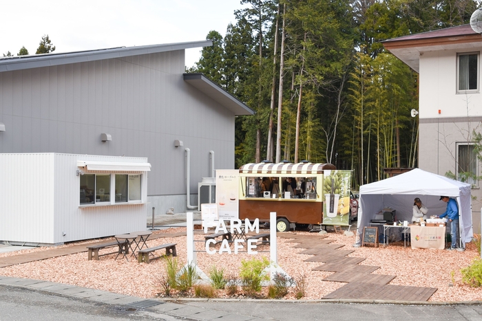 ファームショップ近くに新設された“千本松オープンカフェ”は、飲食店舗が集う週末限定の軽食提供エリア。