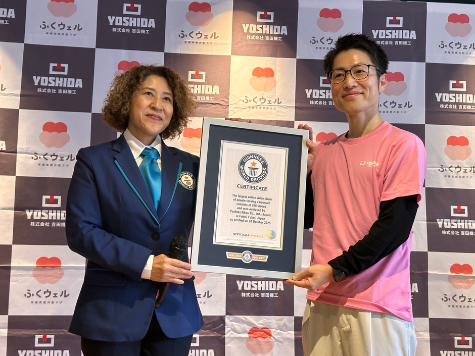 株式会社 吉田機工(本社:福井市、代表取締役:吉田 誠)は、2025年10月24日に「福井市きららパーク/清水まつり」を中心に他5つの会場で開催した参加型イベント「あなたの幸せ聞かせてください!」において、ギネス世界記録(TM)「ブーケトスを繋ぐ最大のオンラインビデオチェーン」を266名で達成し、正式に認定されました。