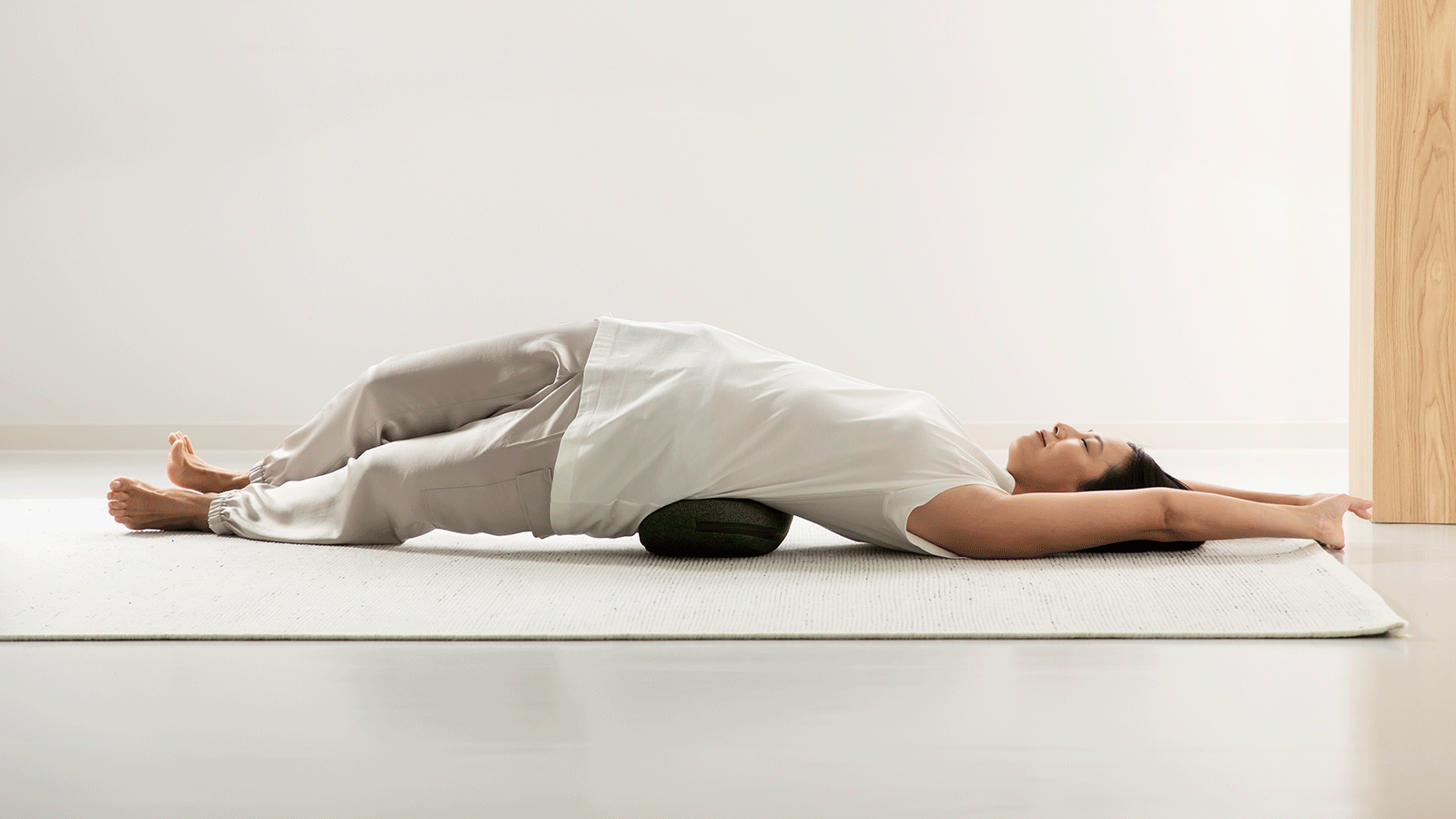 膝を立てた状態で、本商品の上に寝転がります。ゆっくりと腕を上げていき、頭の後ろまで反らします。これにより背中まわりや上半身もしっかりストレッチできます。