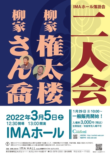 IMAホール(株式会社新都市ライフホールディングス)主催、『IMAホール落語会 柳家さん喬・柳家権太楼「二人会」』が2022年3月5日 (土)にIMAホール(東京都練馬区)にて上演されます。チケットはカンフェティ(運営:ロングランプランニング株式会社、東京都新宿区、代表取締役:榑松 大剛)にて1月29日(土)10:00より発売開始です。
