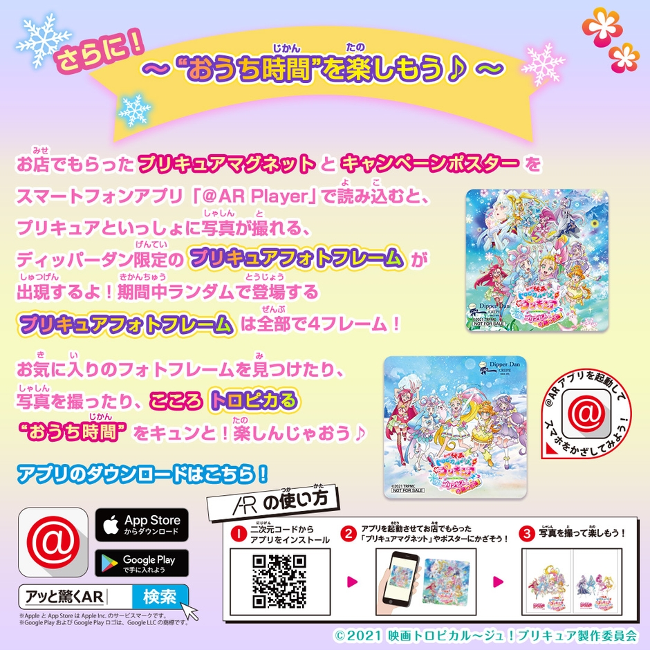 期間中、ディッパーダンへご来店、ご購入の商品を撮影いただき、公式フォロー、キャンペーンタグを付けて投稿してくださった方の中から、抽選で10月23日(土)公開の『映画トロピカル~ジュ!プリキュア 雪のプリンセスと奇跡の指輪!』劇場ポスターをプレゼントいたします!