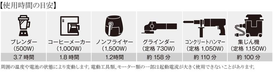 本製品は、最大出力2,400Wと大容量2,150.4Whを誇るリン酸鉄リチウムイオン電池を搭載しており、定格出力が高い家電製品や電動工具など、さまざまな機器での使用が可能です。