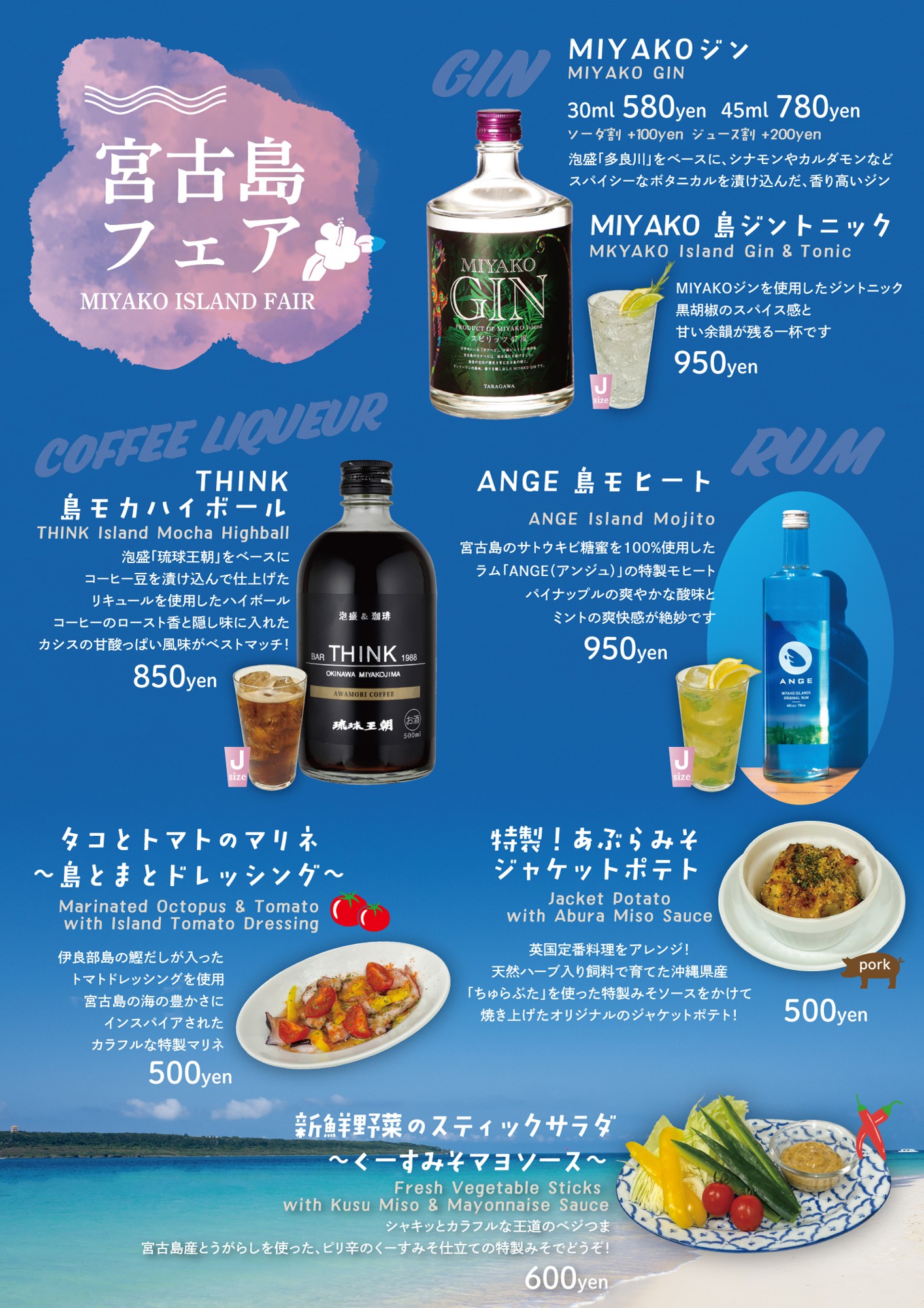 本取り組みの第七弾として、宮古島市(市長:嘉数 登)と連携し、宮古島市の魅力あるお酒や産品を味わっていただける「宮古島フェア(MIYAKO ISLAND FAIR)」を、首都圏エリア、大阪エリア、名古屋エリアの対象店舗で実施します。