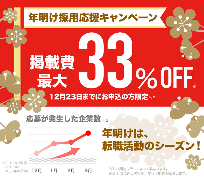 求人サイト「リジョブ」は、未契約企業に向けて、『掲載費が最大33%OFF』になるキャンペーンを開始しており、年内最後となるこのキャンペーンは、年明けの転職活動に向けた企業への最後の後押しとして、急遽発表されました。