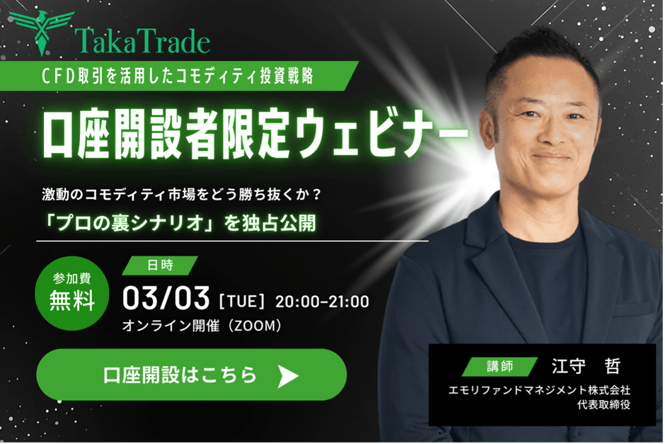 本ウェビナーでは、『CFD取引を活用したコモディティ投資戦略』と題し、TakaTradeの口座開設者だけが知ることができる「2026年春の勝負どころ」を深掘りします。