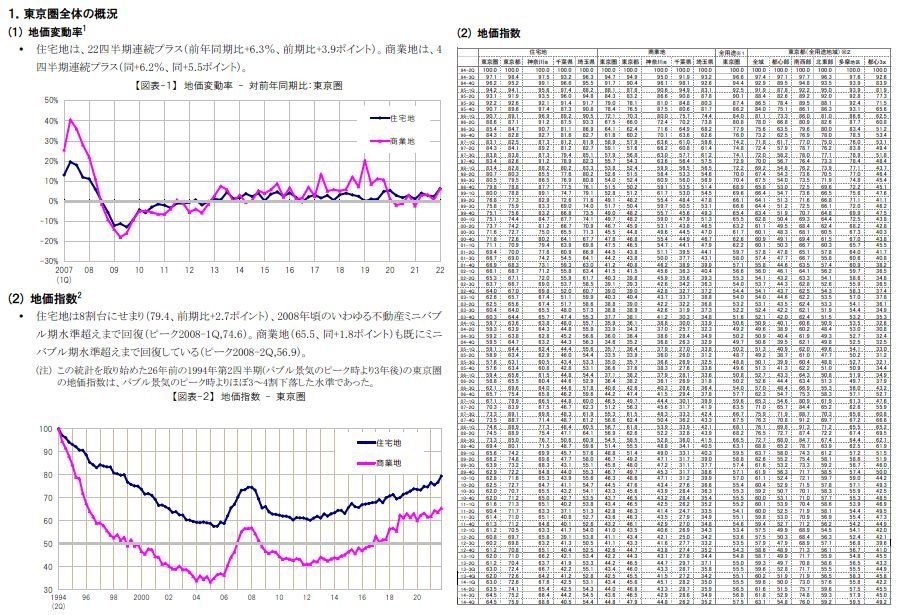 住宅地(8割弱)は、2008年頃のいわゆる不動産ミニバブル期水準超えまで、商業地(6割台)もミニバブル期水準超えまで回復した。
