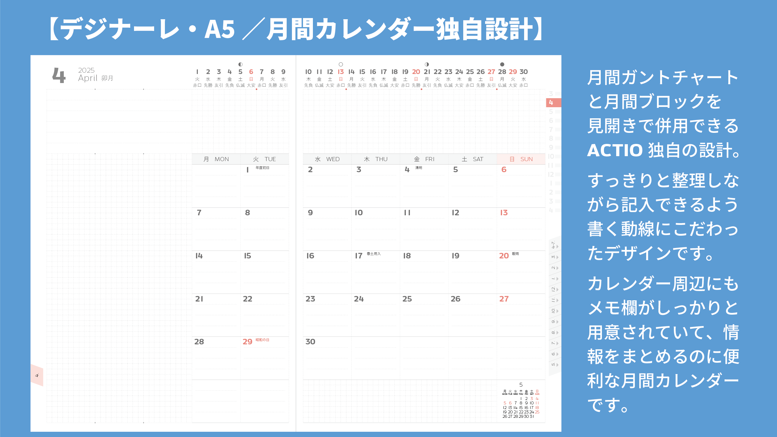 現在、手帳ユーザー様に最も活用されている「週間バーチカル型の週間ページ」と「ブロック型の月間カレンダー」のある手帳。ACTIO手帳は、4月始まりの週間バーチカル型の手帳として、「しっかり書き込みたい派のA5サイズ」を展開しており、月間カレンダー・週間バーチカルともに、ご自身のライフスタイルに合わせてご活用いただけるレイアウトデザインです。