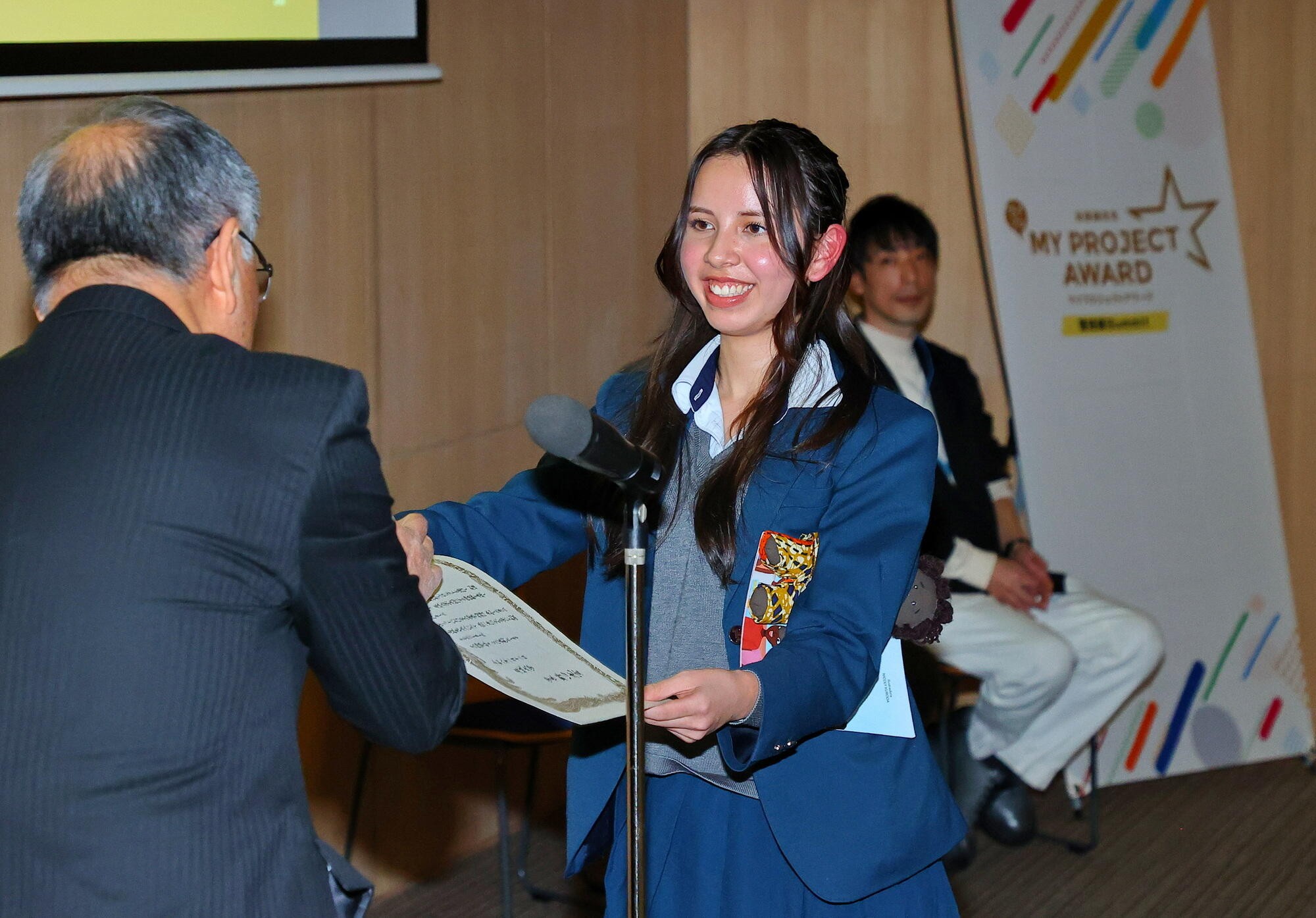 全プロジェクトの発表後、選考で選ばれた12組が3教室に分かれてあらためて代表発表が行われ、名城大学賞と中日新聞社賞、マザーハウス賞が選出されました。本学の野口光宣学長が審査員を務めた名城大学賞には、アフリカの最貧国モザンビークの子どもたちを性被害から守るため、クラウドファンディングで集まった資金で絵本を制作して現地で読み聞かせを行うなどの性教育に取り組んだ豊丘高校(豊橋市)2年の川本あいらさんが選ばれ、野口学長から賞状が手渡されました。