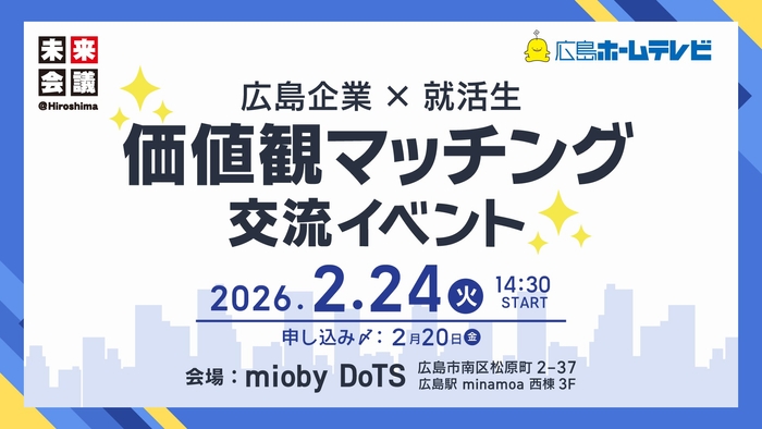 株式会社広島ホームテレビ(広島県広島市中区白島北町19-2)は、“価値観”を軸に広島の企業と学生が出会う就活イベント「価値観マッチング交流イベント」 を2026年2月24日(火)、広島市内で初めて開催します。