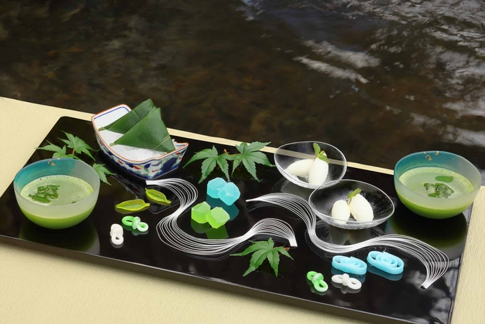 翡翠の中では、盆景涼菓とスタッフが点てる冷抹茶を味わいます。盆景とは、盆上にあらゆる大自然の情景を立体的に表現してその美と寂(さび)をめでる日本独特の風流なあそびです(*2)。本アクティビティでは、夏の果物を使ったソルベや麩まんじゅうなどの涼やかな菓子で奥嵐山の情景を表現しました。冷抹茶とは、濃い目に点てた抹茶に氷を入れて冷たくしたもので、夏ならではの飲み物です。涼やかな渓谷の風情と共に盆景涼菓と冷抹茶を味わうことで、自然の涼やかさを感じることができます。