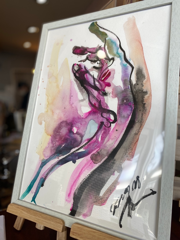 さらに店内には県内外、また世界中のアーティストの作品を定期的に展示させていただいております。アーティストさんとはInstagramやFacebookで随時募集。SNSから始まり、リアルでもみなさんとお会いできる機会を大切に考えています。現在のアートはアメリカ出身、香川で活躍されているWilliam Vogler氏の陶芸、岡山出身の龍絵師「虎香」の作品、香川県出身で香川県を中心に己書を広めている楽人道場の葛西 幸代さんの作品、そして今回新たに世界で活躍している羽鳥 弘興さんの水彩画を展示しております。