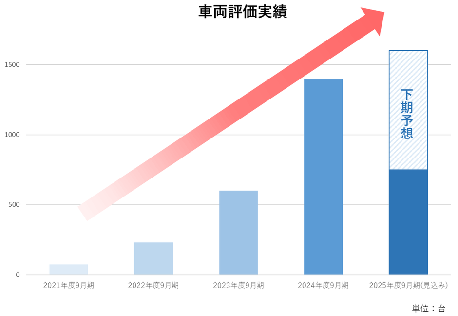 「車両評価」はサービス提供を開始した2018年度より着実に実績を積み重ねてまいりました。特に直近3年間でご依頼が急拡大し、2024年9月期の評価実績は、2022年度9月期比で約6倍、2025年9月期も前年を超えるご依頼が予想されます。