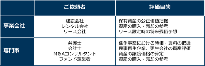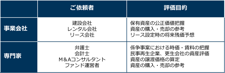 評価のご依頼は、以下のように広範な業種・目的に及びます。