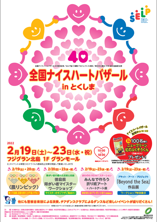 2022年2月19日(土)~23日(水)の5日間、フジグラン北島1階 グランモール(徳島県)にて、「全国ナイスハートバザール 2021 in とくしま」を開催いたします。
