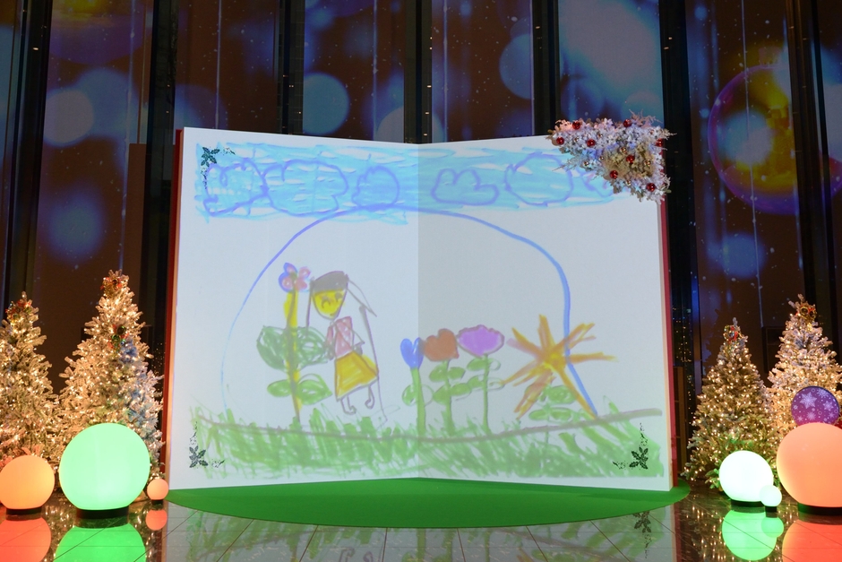 巨大絵本に見立てたスクリーンに 園児が描いたイラストを投影! 「住友不動産東京三田ガーデンタワー」で 12月25日(月)まで、クリスマスイベントを開催。 日比谷花壇が装飾を担当しました。