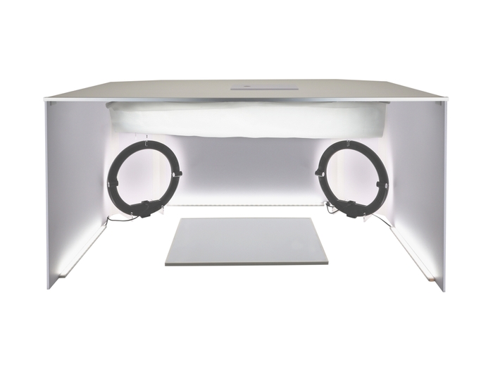 この装置は、自宅やオフィスなど作業場所が違っても室内の光源の向きや明暗などに影響されず、卓上に設置するだけで影や写り込みの問題などをクリアし、今までにないきれいな手元作業の撮影を可能にするものです。