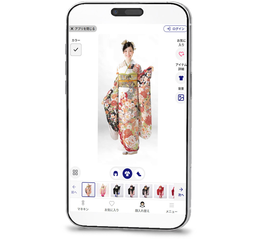 気になる振袖をタップするだけで、一瞬で着替えが完了。何十着でも納得いくまで試すことができます。さらに、振袖に合わせた「髪型(ヘアアレンジ)」や「背景」の変更も可能。当日の雰囲気をトータルでシミュレーションできます。