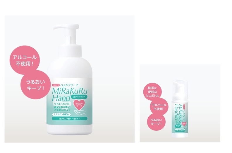 手からの感染対策には「美ラクルハンド」。低刺激で洗浄効果が高いアルカリイオン水をベースにアミノ酸を主とした有効成分を配合した化粧品です。有効成分が利用した際に手指に残留するため、従来のアルコール系消毒剤と比べ、長時間(48時間)効果が持続します。さらに手肌に優しい保湿成分をプラス、乾燥を防ぎながら清浄に保ちます。洗い流す必要のない、手間なしハンドクリーナーです。