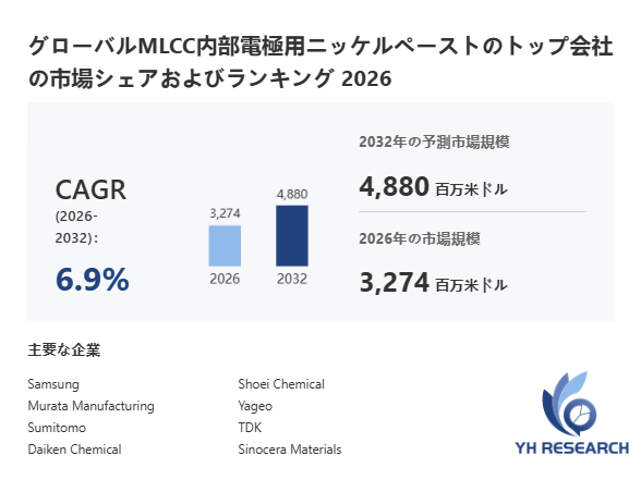 YHResearch調査チームの最新レポート「グローバルMLCC内部電極用ニッケルペーストのトップ会社の市場シェアおよびランキング 2026」によると、2026年の3274百万米ドルから2032年には4880百万米ドルに成長し、2026年から2032年の間にCAGRは6.9%になると予測されています。