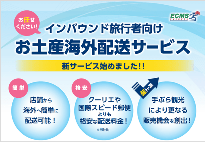 株式会社ECMSジャパン(本社:東京都中央区、代表取締役社長:小松 英樹)は、2022年11月8日(火)よりインバウンド事業者向け日本発海外向けの国際宅配便サービス『お土産海外配送サービス』を開始します。