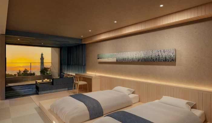 界 出雲の全5タイプの客室すべてがご当地部屋「彩海の間」。客室からは、刻々と表情を変えていく空や海の景色を楽しめるため、その様子を「彩海」と表現しました。また、界 出雲から最も近い神社である日御碕神社の下の宮は、「日沉宮(ひしずみのみや)」と呼ばれ、天照大御神が祀られています。伊勢神宮が「日の本の昼を守る」ことに対し、日御碕神社は「日の本の夜を守る」と言われています(*1)。その言い伝え通り、このエリアでは、夕日が沈む時から夜が明けるまでの景色の移り変わりを堪能できます。日御碕灯台を望む客室からは夕日に赤く染まる情景を、出雲松島を望む客室からは朝焼けに包まれる景色など、全39室の客室、それぞれ異なる海の彩りを感じることができます。
