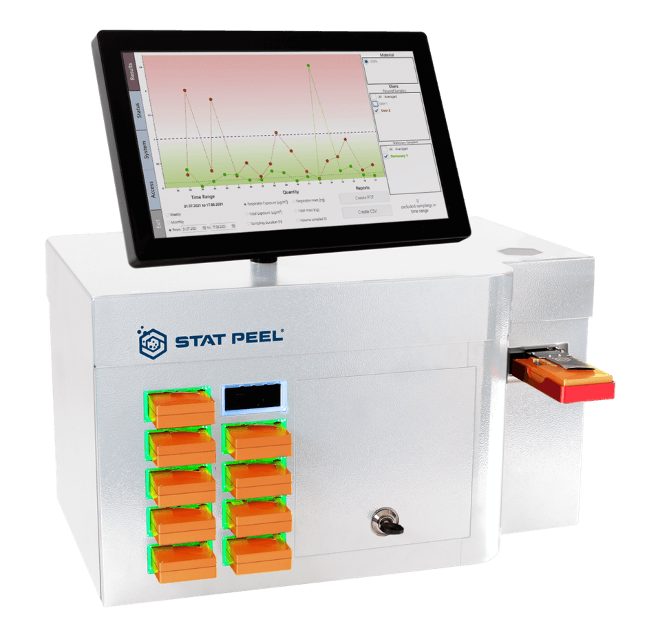 スタットピールは、作業員または作業現場において簡単に使用可能なナノ物質の集塵バッジの開発、そしてバッジからナノ物質の確実な同定とデータ管理を同時に行う検出システム・Identifierを開発いたしました。
