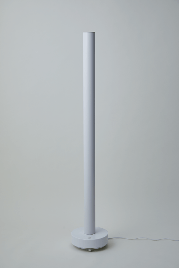 UVC空気清浄機のサイズは床面積Φ250mm×高さ1439mmで、台座を除いた部分はΦ75mmと細長い筒状形状になっています。この細長い筒内に40形直管紫外LEDを搭載しており、装置下から吸引した空気を装置の上から排出する間に紫外線を十分に当てることで空気を除菌し、室内全体の空気を清浄化します。