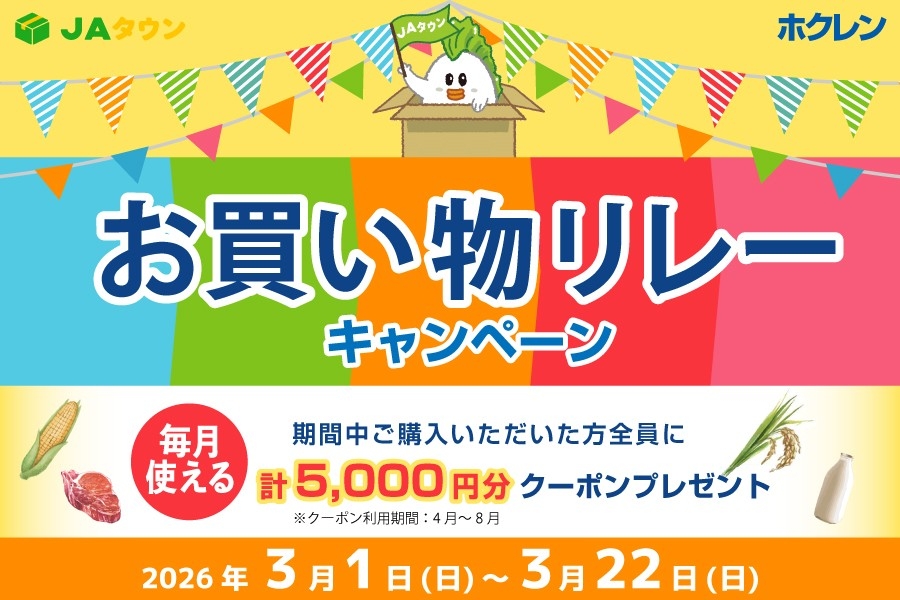 JA全農が運営する産地直送通販サイト「JAタウン」のショップ、北海道の「ホクレン」は、ショップスタッフが厳選したおすすめ商品30品以上を「お客様送料負担なし」で購入できるキャンペーン、および、購入者全員に翌月から利用できるクーポンをプレゼントする「お買い物リレーキャンペーン」を開催中です。