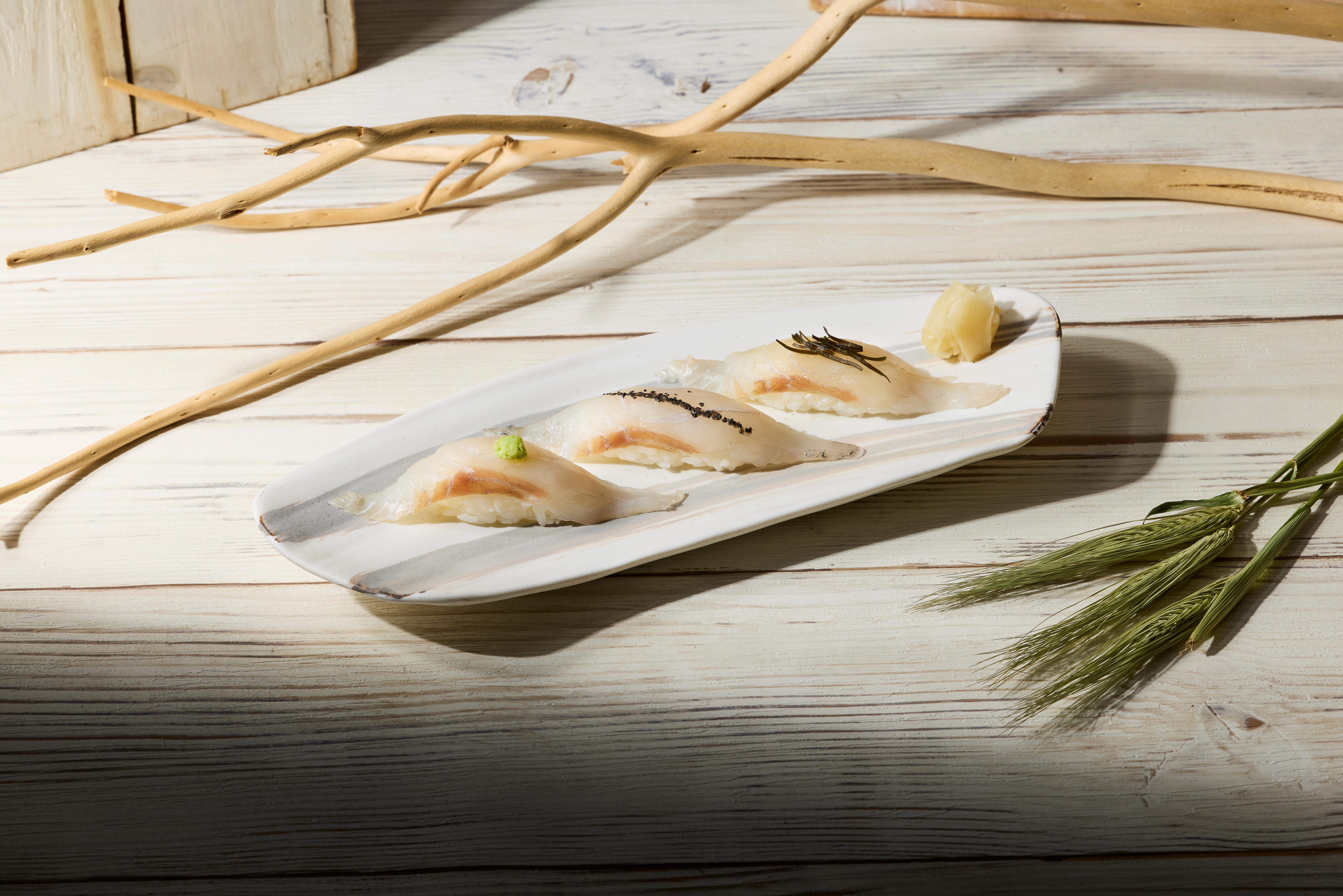 ワイエスの境界の表現に着目し、味の境界と捉えて同じ食材を違う食べ方でその境界を感じていただきたく、スズキを3種類の握りの形で提供します。