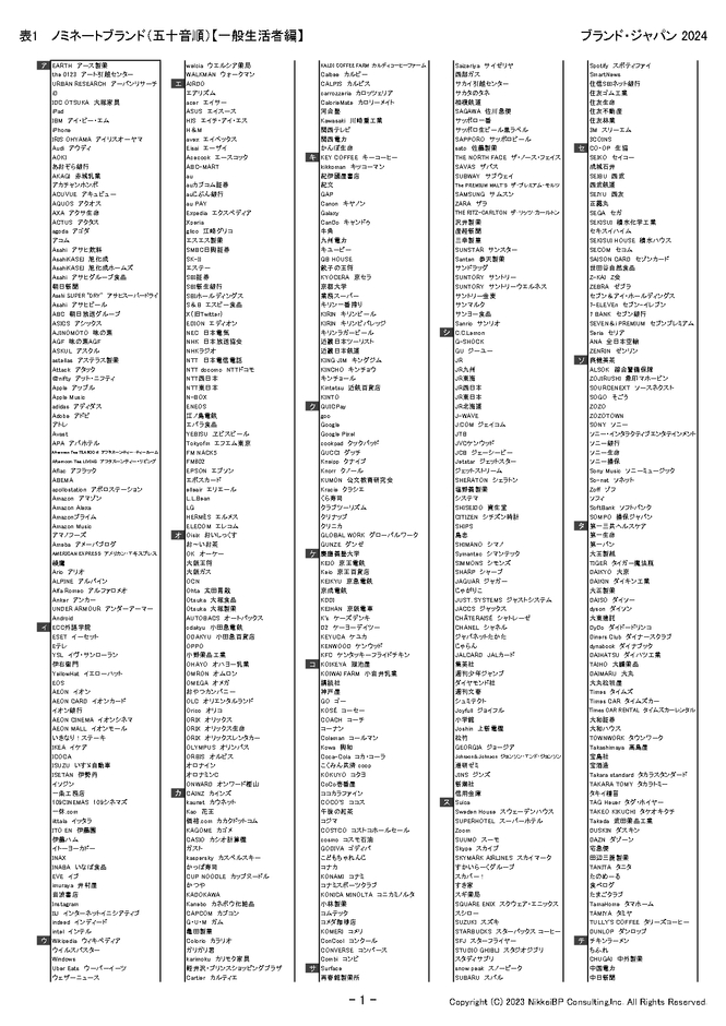 株式会社日経BPコンサルティング(東京都港区)は、2024年3月22日に発行予定の「ブランド・ジャパン2024」で調査対象となる1,500ブランド(一般生活者編1,000ブランド、ビジネス・パーソン編500ブランド)を発表しました(表1~3)。