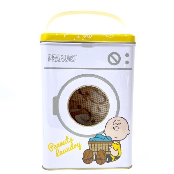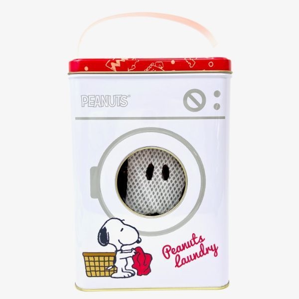 洗濯機のようなデザインのパッケージ缶から覗くスヌーピー。中身は…